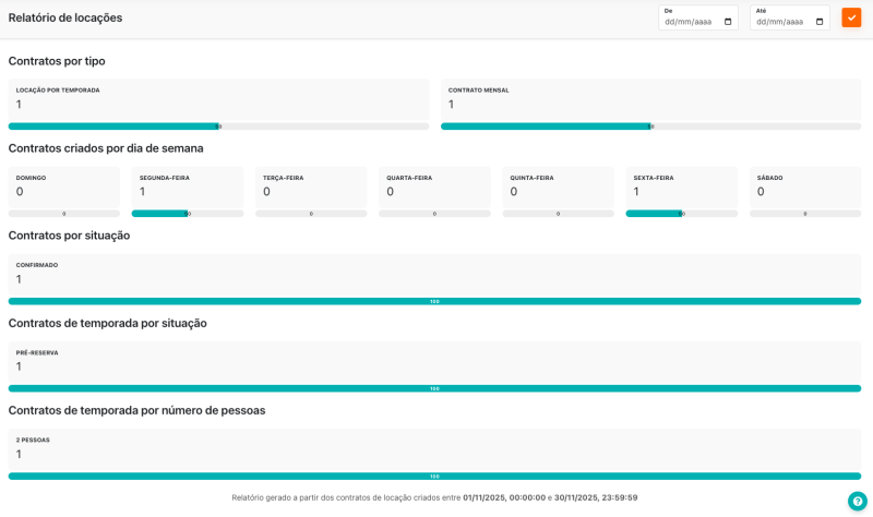 - Consulte o relatório de temporada e o relatório de locações e veja os novos gráficos por mês/ano e o filtro por dia.