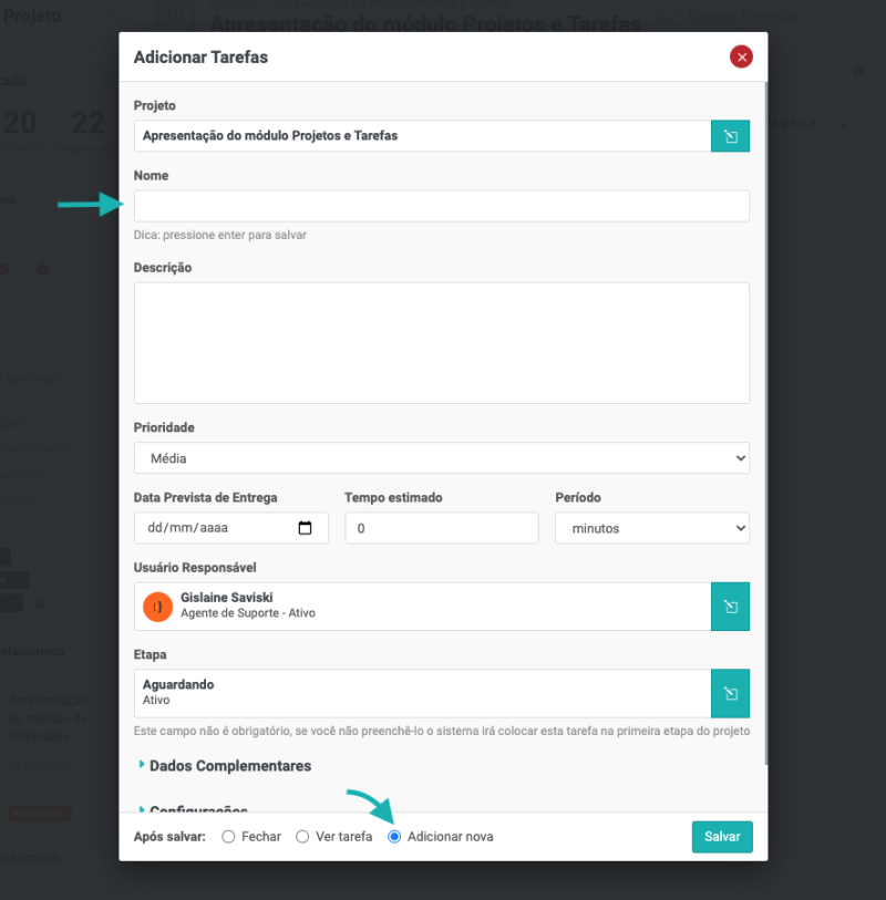 Dica: Para que o cadastro das tarefas seja mais fácil, deixe marcado a opção Adicionar nova.