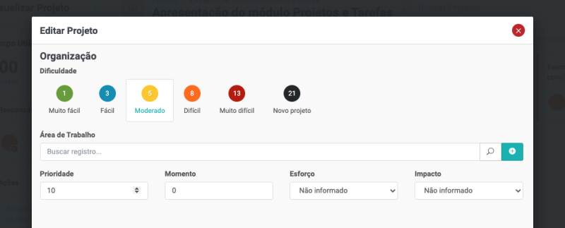 Seguindo o formulário de cadastro do projeto, chegamos ao grupo organização. Aqui você pode selecionar a área de trabalho do projeto, definir a prioridade, momento, esforço e impacto.