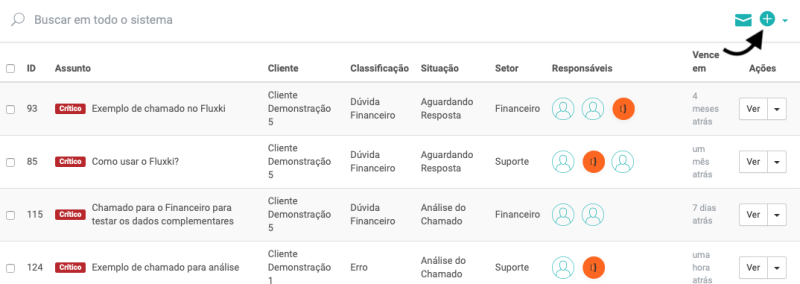 Para adicionar um novo chamado, clique no botão adicionar (+), que está localizado no canto superior direito da tela, conforme a imagem abaixo: