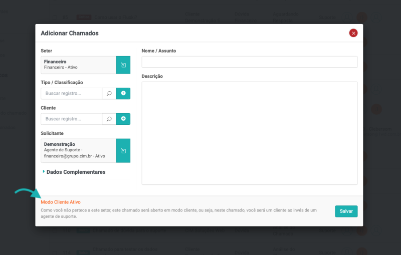 Se o agente de suporte informar um setor que ele não pertence, o chamado será aberto para o setor preenchido e ele se tornará o cliente do chamado.