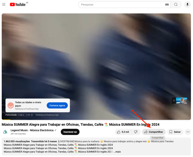 Neste exemplo vamos utilizar um vídeo que está hospedado no YouTube. Para obter o código de incorporação encontre o vídeo desejado no youtube, e em seguida, clique no botão compartilhar, conforme a imagem abaixo: