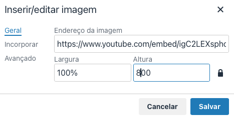 Agora aparecerá um campo para você informar o código para incorporar o vídeo. Para obter este código acesse o provedor de vídeos que você deseja.