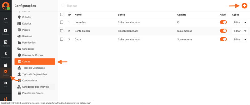 O primeiro passo é cadastrar a conta bancária. Acesse o módulo Ajustes e clique em Contas. Para cadastrar a conta, clique no botão (+), conforme a imagem abaixo: