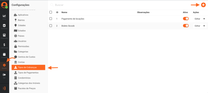 Após cadastrar as contas, agora será necessário cadastrar as formas de cobrança. Acesse o módulo Ajustes e em seguida clique em Tipos de cobrança, conforme a imagem abaixo: