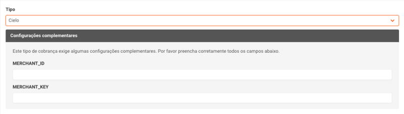 Se selecionar o tipo Cielo, será necessário informar o MERCHANT_ID e MERCHANT_KEY. Essas informações deverão ser solicitadas no suporte da Cielo.