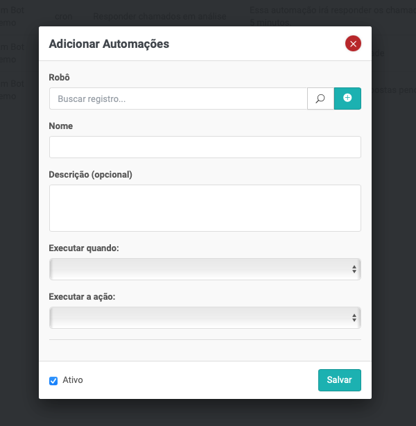 Em seguida, clique em + para adicionar a automação. O formulário de cadastro da automação será exibido na tela.