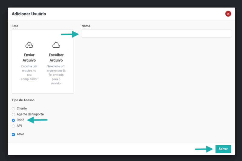 O sistema irá exibir a tela de cadastro de usuário. Nessa tela selecione o tipo de acesso Robô e em seguida informe o Nome.