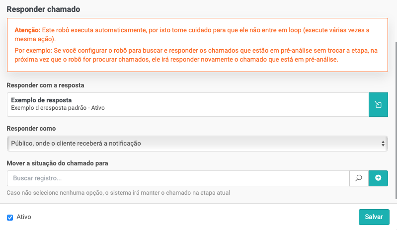E para finalizar, configure a nova etapa do chamado ou situação do chamado. Este campo é opcional, porém a automação é executada automaticamente, então preste atenção nas configurações definidas no cadastro, para evitar que a automação entre em loop (enviando várias mensagens no mesmo atendimento / chamado).