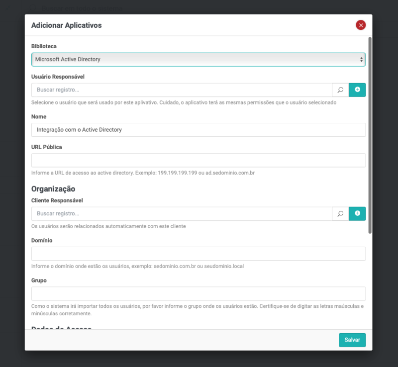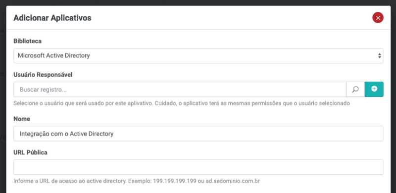 - URL pública: Informe qual a URL de acesso ao active directory.