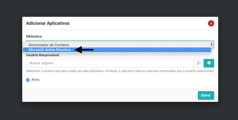 No campo biblioteca, selecione a opção Microsoft Active Directory, conforme a imagem abaixo: