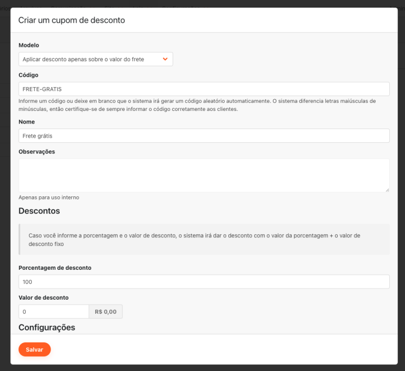 Clique em "Salvar" para finalizar a configuração do cupom.
