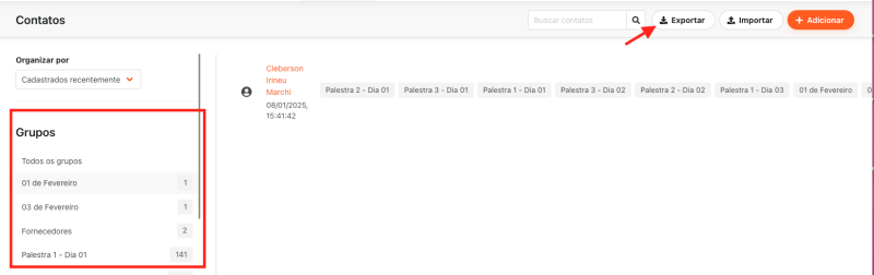 Para exportar a lista de contatos, clique no botão "Exportar":
