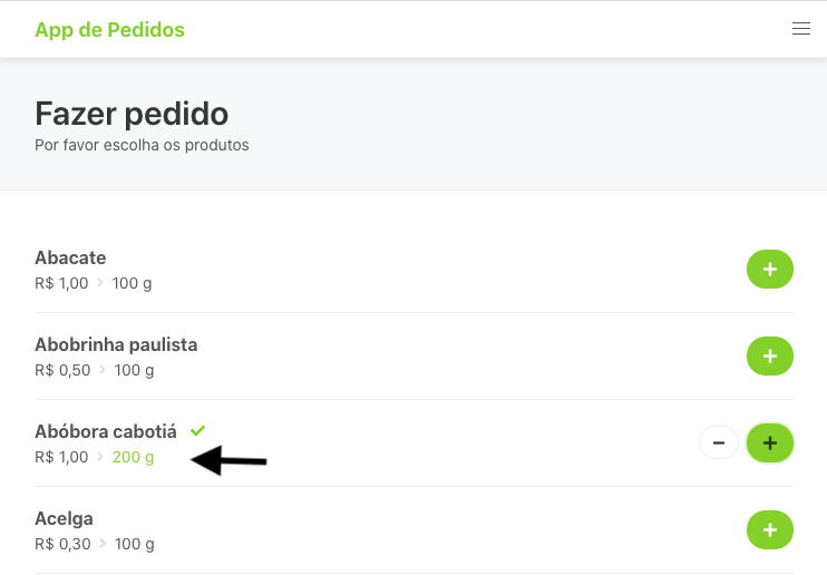 Fique atento com a quantidade selecionada. Como apresentado na imagem abaixo, selecionei 200g de abóbora cabotiá.