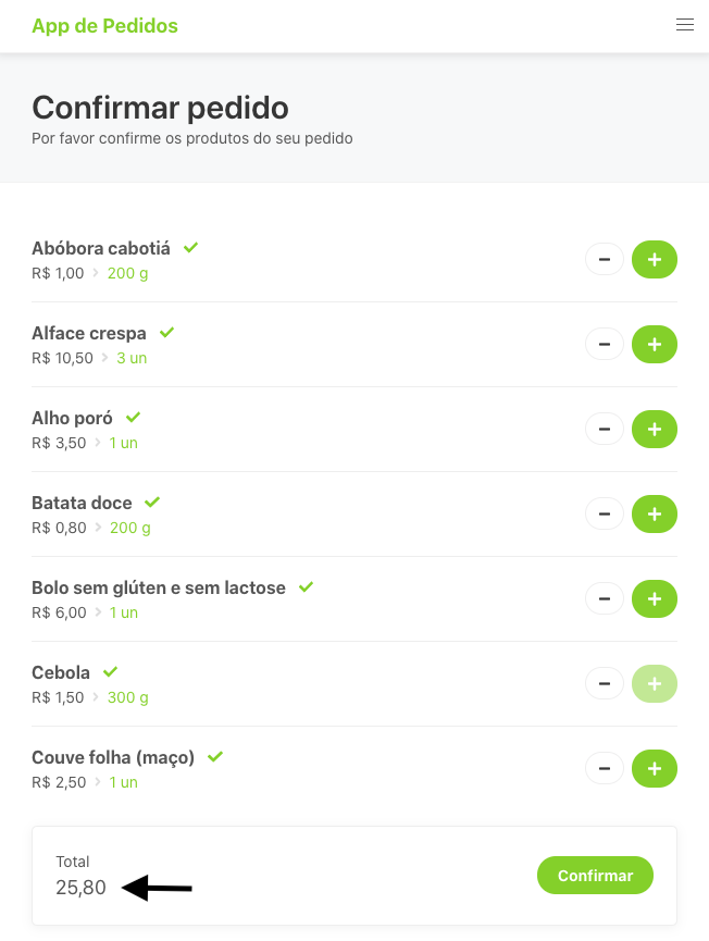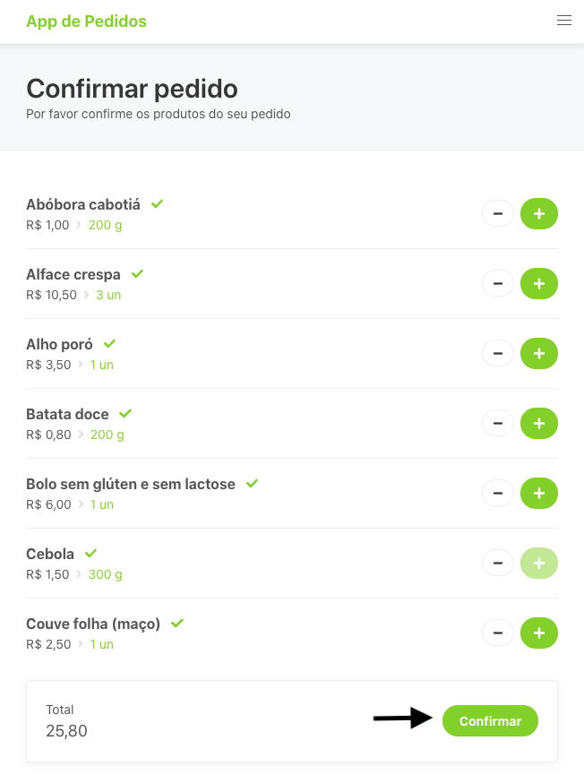 Com isso, o aplicativo irá exibir a lista com todos os produtos selecionados no passo anterior. Confira se a lista está correta e a quantidade selecionada.