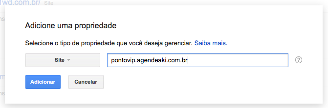 O próximo passo será adicionar o domínio (ou propriedade) do seu site, conforme imagem abaixo: