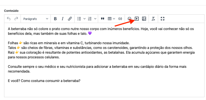 A plataforma permite incorporar vídeos no corpo (meio) do post do blog. Para isso, no editor de texto, clique no ícone de vídeo, conforme a imagem abaixo: