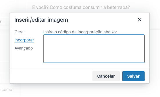 Será exibido na tela o formulário para inserir o vídeo. Clique na opção Incorporar: