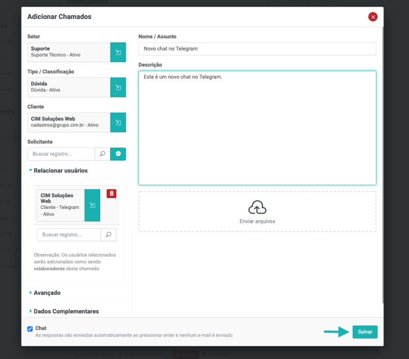 Atenção: Caso já exista algum chamado do tipo chat do Telegram, ativo para o usuário, ele será desvinculado, ficando ativo apenas o último chamado que foi criado.