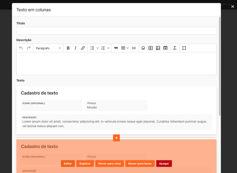 Este componente possui título, descrição o cadastro dos textos em colunas. Em nosso exemplo, vamos apenas preencher o campo de Texto, deixando os demais campo em branco: