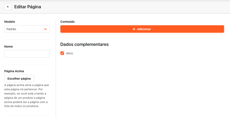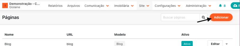 Para adicionar uma nova página, clique em no botão Adicionar, no canto superior direito da tela: