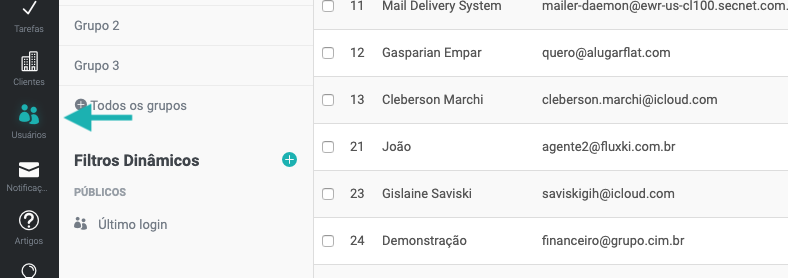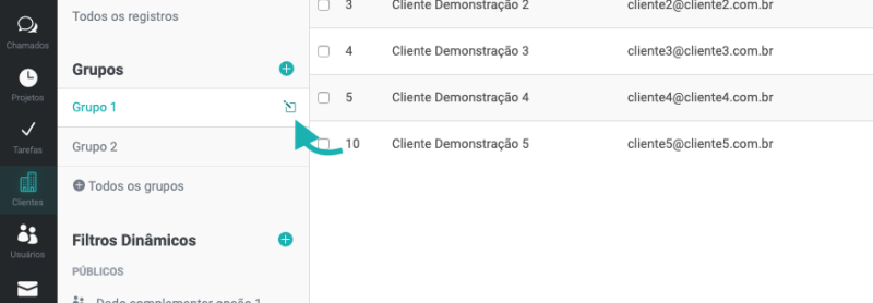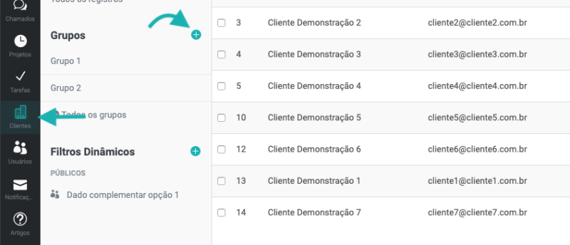 O sistema permite adicionar e relacionar os clientes e usuários em grupos. Desta forma, quando você enviar uma notificação, por exemplo, poderá selecionar o grupo e todos os clientes relacionados serão notificados.