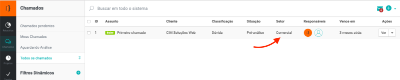 No exemplo abaixo, o usuário atendente pertecence ao setor Comercial, e o sistema listou apenas os chamados que estão em aberto deste setor: