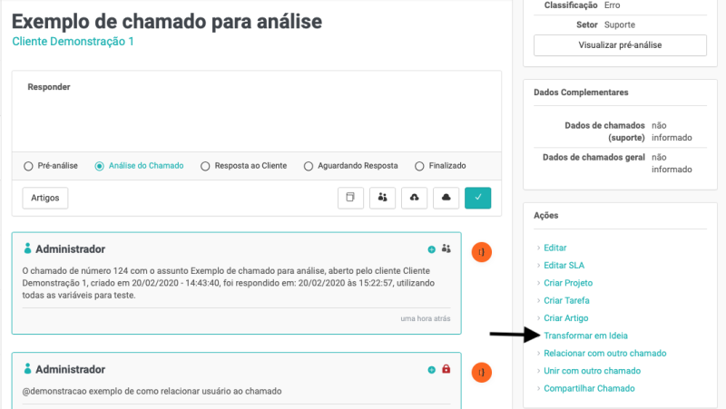 Caso você queira transformar o chamado em uma ideia para votação, na página do chamado, nas ações clique em Transformar em ideia, conforme a imagem abaixo: