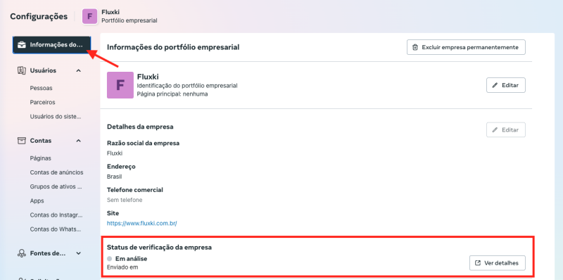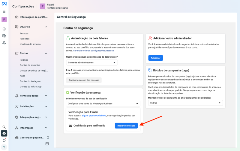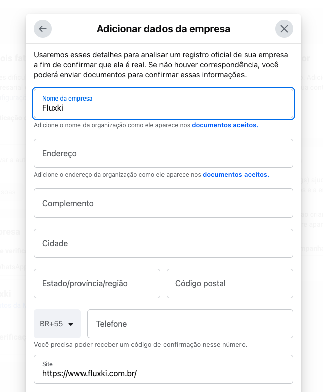 A verificação de empresa é habilitada após iniciada a etapa de configuração do WhatsApp Business API, ou seja, após adicionar o número de telefone que será utilizado para receber mensagens no Fluxki.