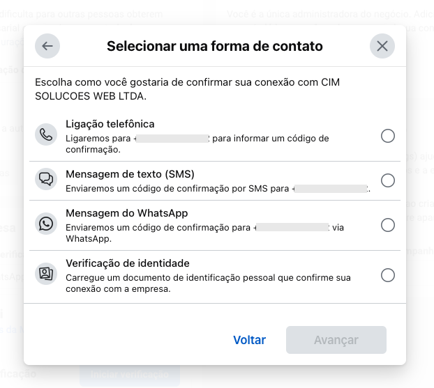 Você poderá escolher entre Ligação, telefônica, Mensagem de texto (SMS), Mensagem no WhatsApp ou Enviar um documento de identidade.