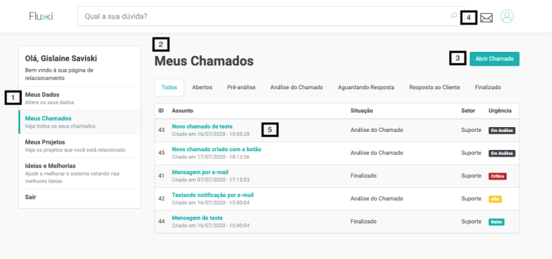 Ao clicar no nome do chamado (marcador 2), o chamado será aberto na tela e você poderá acompanhar as respostar e enviar novas mensagens no chamado.