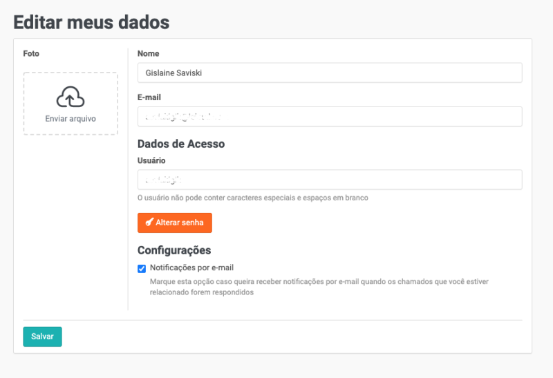 Aqui você poderá alterar o nome, e-mail, configurar sua foto, alterar o usuário e a senha, além de habilitar as notificações por e-mail.