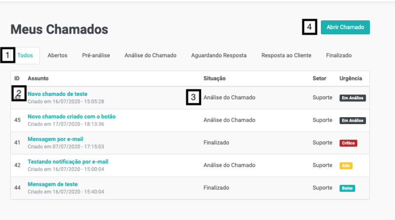 O marcador 3 é a situação do chamado.