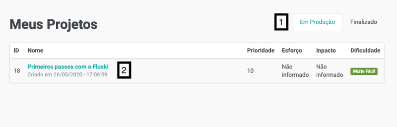 Você poderá filtrar os projetos pela situação (Em produção ou Finalizado), conforme o marcador 1.