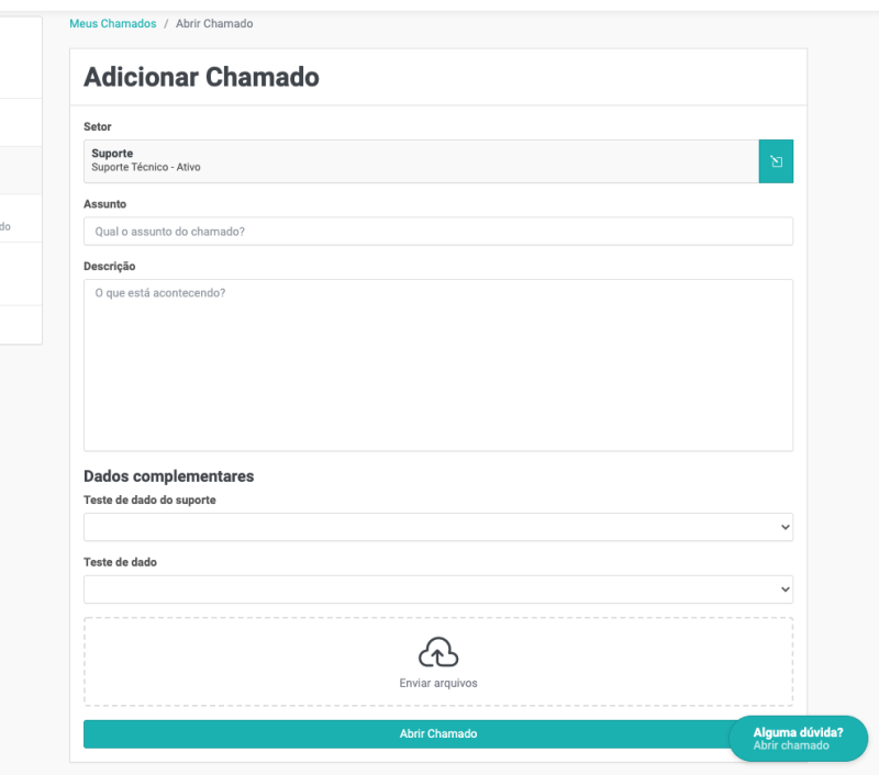 Na área do cliente, clique no botão Abrir chamado ou Alguma dúvida?, que o formulário do registro do chamado será exibido:
