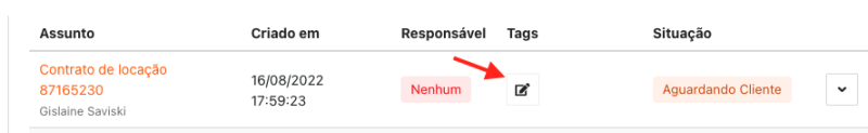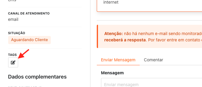 Outra forma de adicionar tags na mensagem é na tela de visualizar / responder a mensagem. Na barra de informações em Tags, conforme a imagem abaixo: