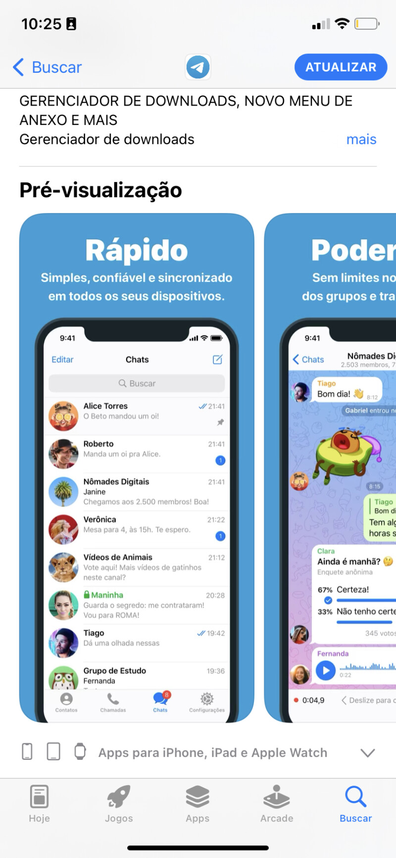 Uma descrição de seu app, detalhando recursos e funcionalidade. Ela também será usada em seu app do Apple Watch.