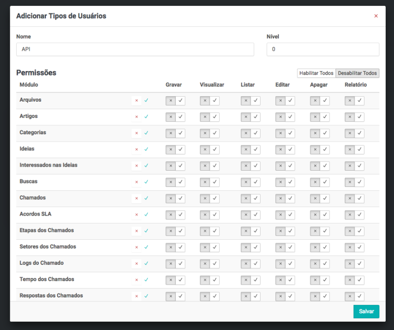 Como este usuário servirá apenas para fazer o login no sistema, não será necessário que ele tenha permissão a nenhum recurso do sistema. Então, clique na opção desabilite todas as permissões e, em seguida, clique em salvar para criar umo novo grupo de permissões de usuários.