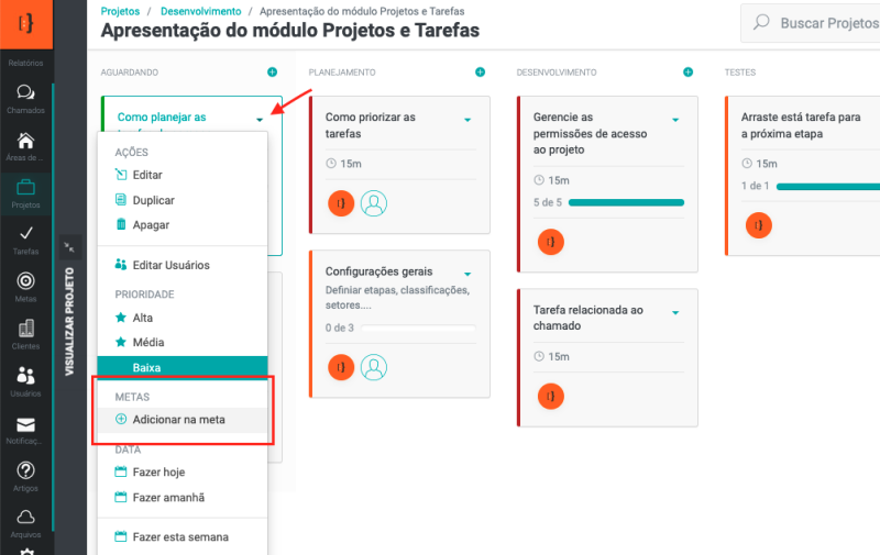 Diferente da área de trabalho, onde o projeto e todas as suas tarefas são relacionadas, na meta você poderá relacionar tarefas de diversos projetos.