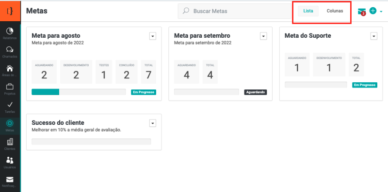 Além disso é possível visualizar as metas em Lista (imagem acima) ou Colunas (imagem abaixo):
