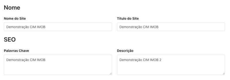 Aqui você poderá personalizar o Nome e Título do Site e as configurações de SEO como as palavras-chave e a descrição: