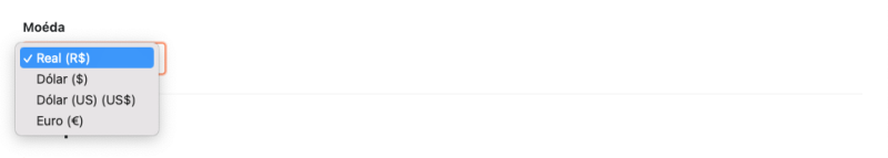 Outro item que pode ser personalizado é a moeda padrão que será utilizada no sistema.