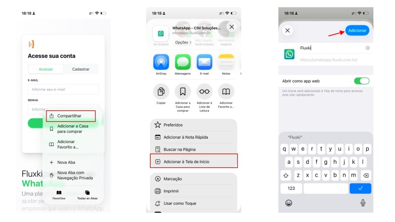 Adicionar o aplicativo do Fluxki Conversas é simples: use o menu de compartilhamento no iPhone (Safari) ou o menu do navegador no Android.