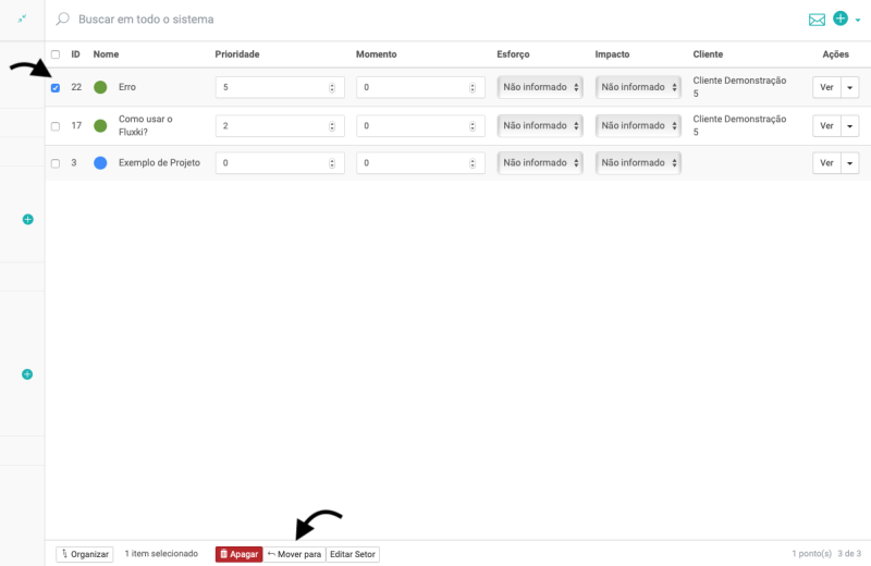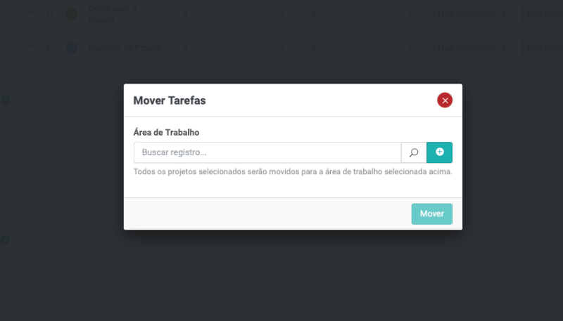 Para mover o projeto para a área de trabalho, selecione o projeto na lista e em seguida clique em Mover para, conforme a imagem abaixo: