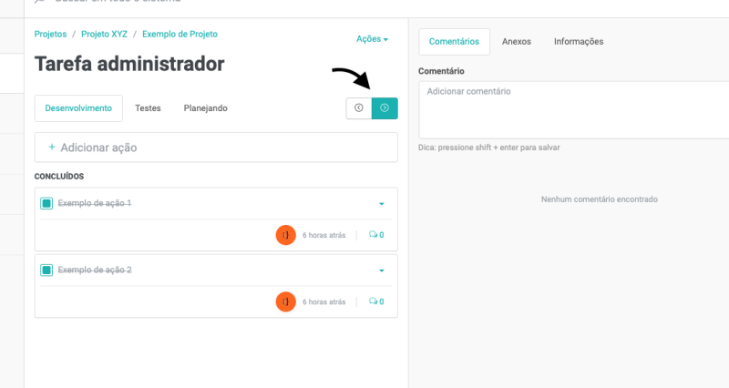 E, para adicionar comentários nas ações, clique no ícone de comentários, na ação desejada: