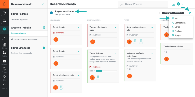 Outras funcionalidades dos projetos e tarefas