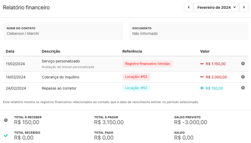 Agora é possível visualizar o relatório financeiro de cada contato individualmente. O relatório mensal e você pode navegar facilmente entre os meses.