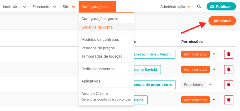 Para criar um usuário para o proprietário, acesse a área de usuários da conta e depois clique no botão adicionar, conforme a imagem abaixo:
