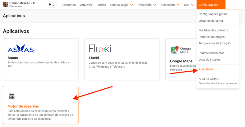 Para habilitar o motor de reservas acesse a área de aplicativos do sistema e clique sobre o aplicativo de motor de reservas, conforme a imagem acima.