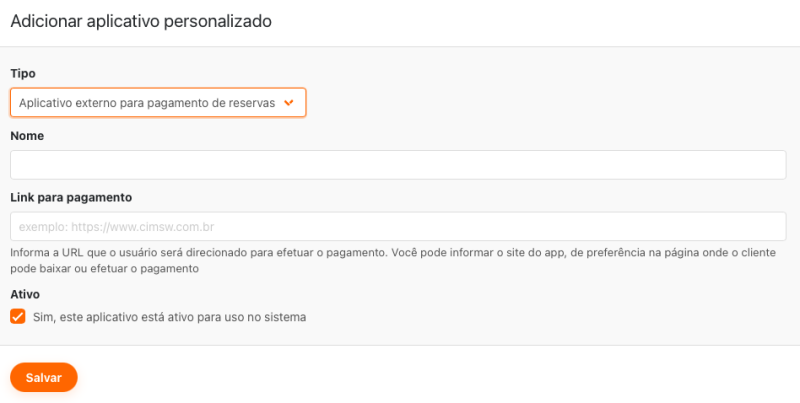 - Escolha o tipo: Aplicativo externo para pagamento de reservas
